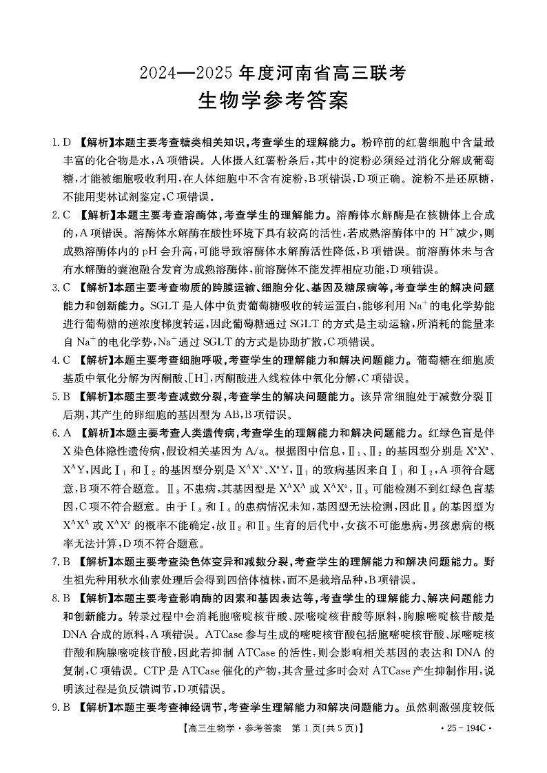 河南省部分高中2025届高三年级上学期12月联考生物答案