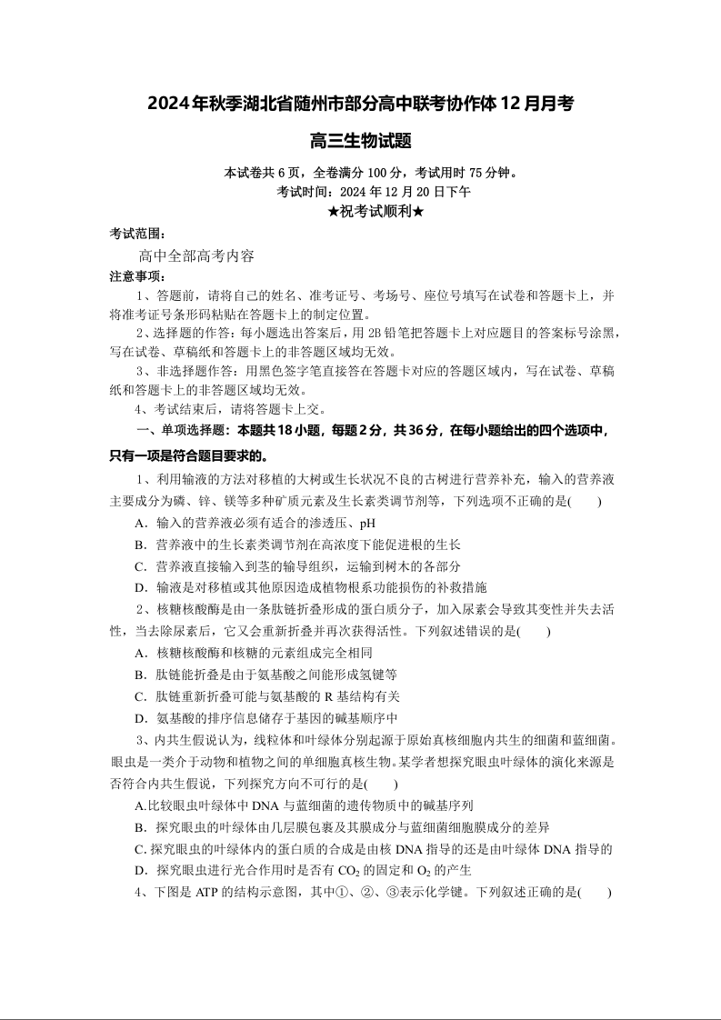 湖北省随州市部分高中联考协作体2025届高三上学期12月联考生物