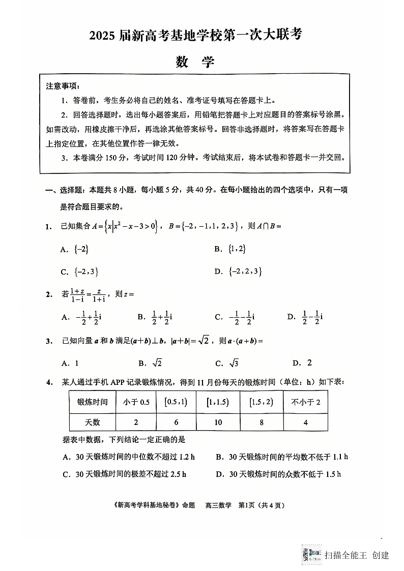 江苏省南通市新高考基地学校2025届高三上学期12月第一次大联考数学