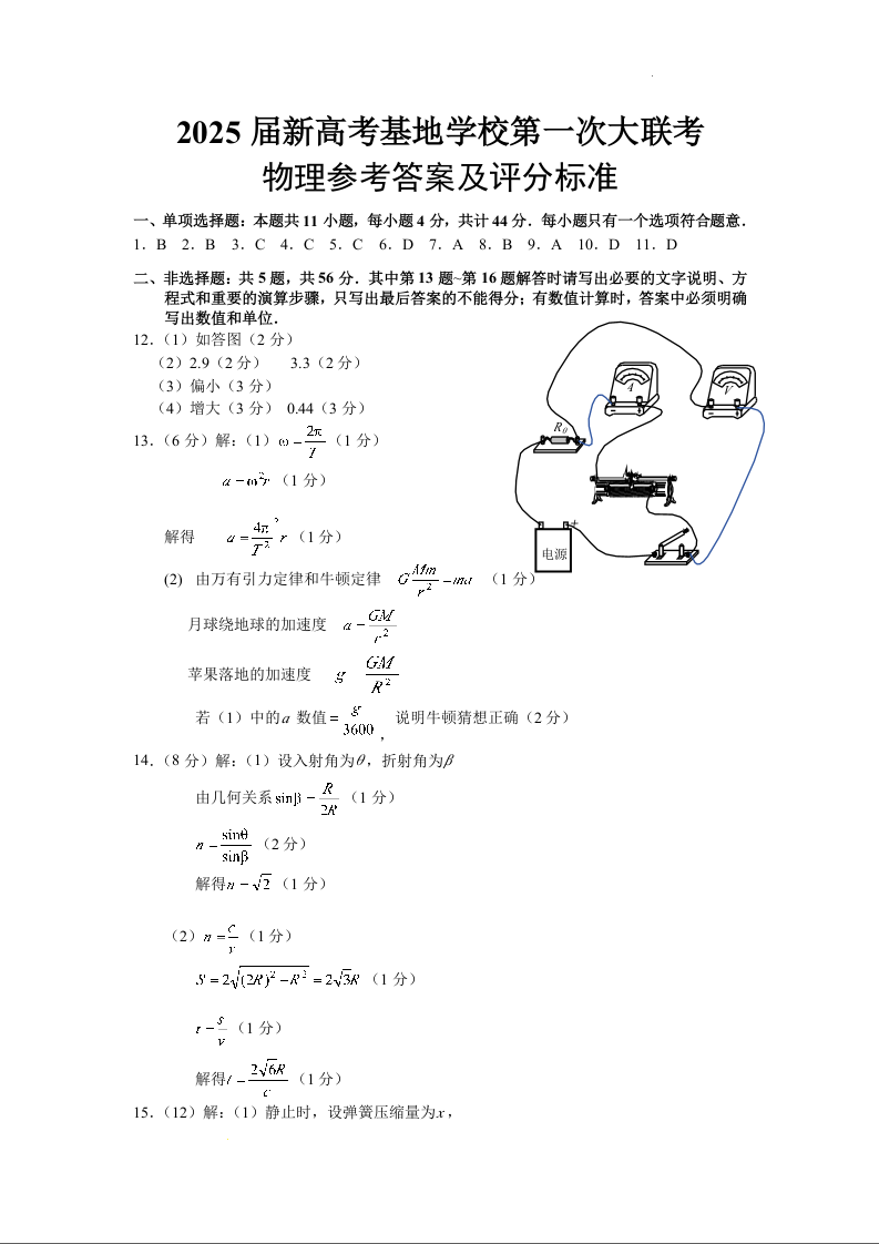 江苏省南通市新高考基地学校2025届高三上学期12月第一次大联考物理答案