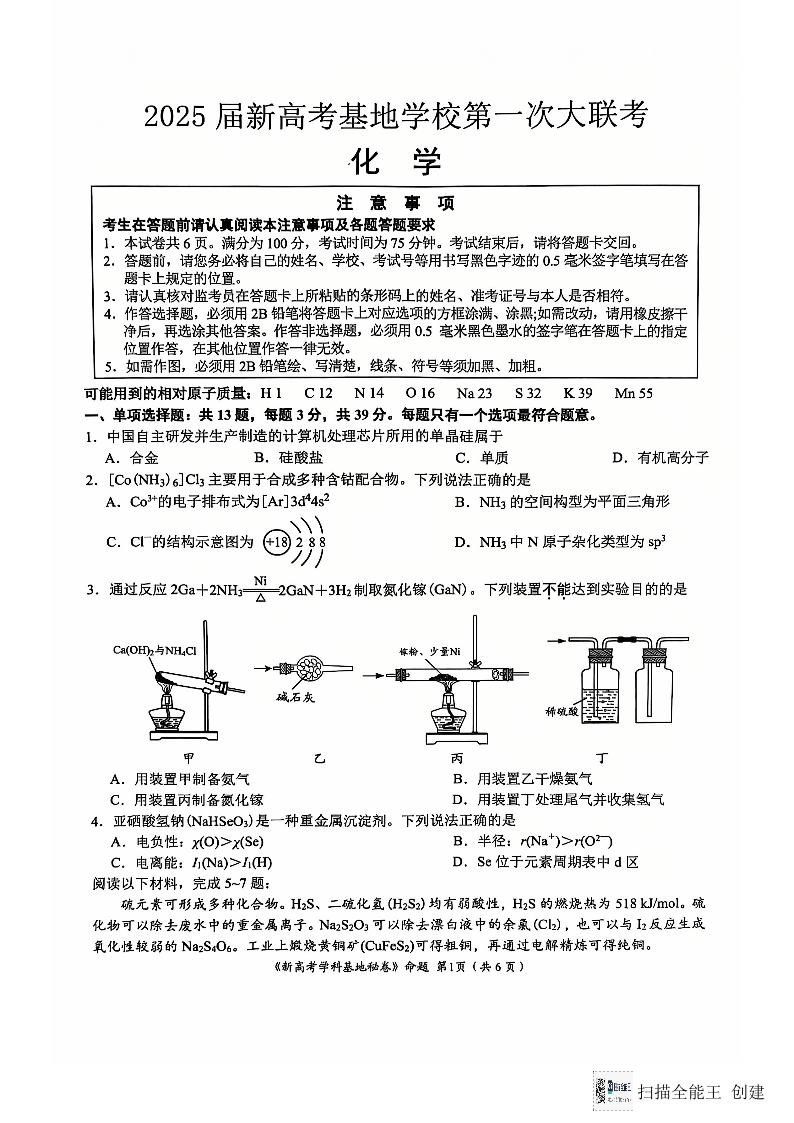 江苏省南通市新高考基地学校2025届高三上学期12月第一次大联考化学