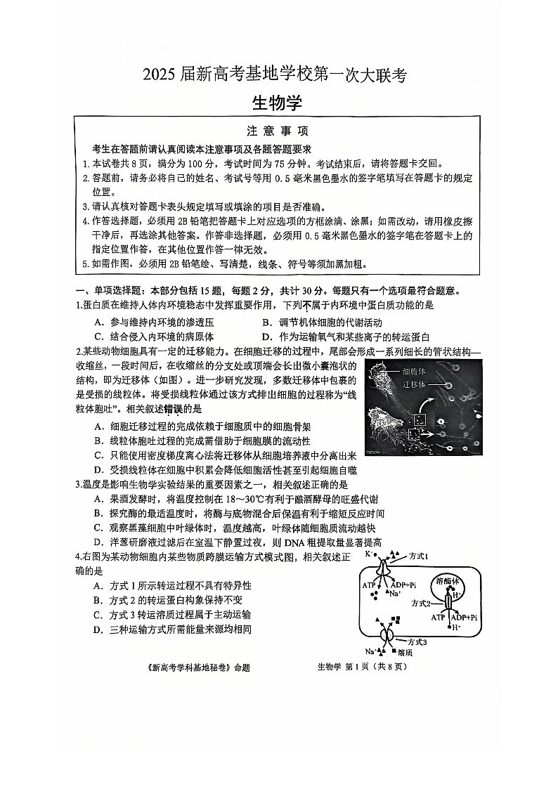 江苏省南通市新高考基地学校2025届高三上学期12月第一次大联考生物+答案