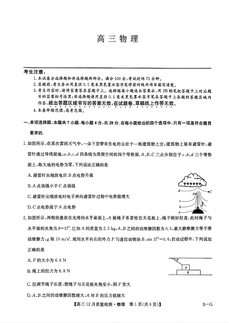 河南省部分高中2025届高三年级12月质量检测巩固物理