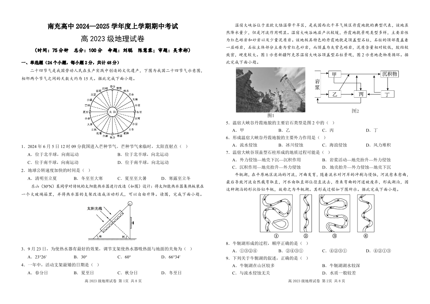 四川省南充高级中学2024-2025学年度上学期期中考试地理