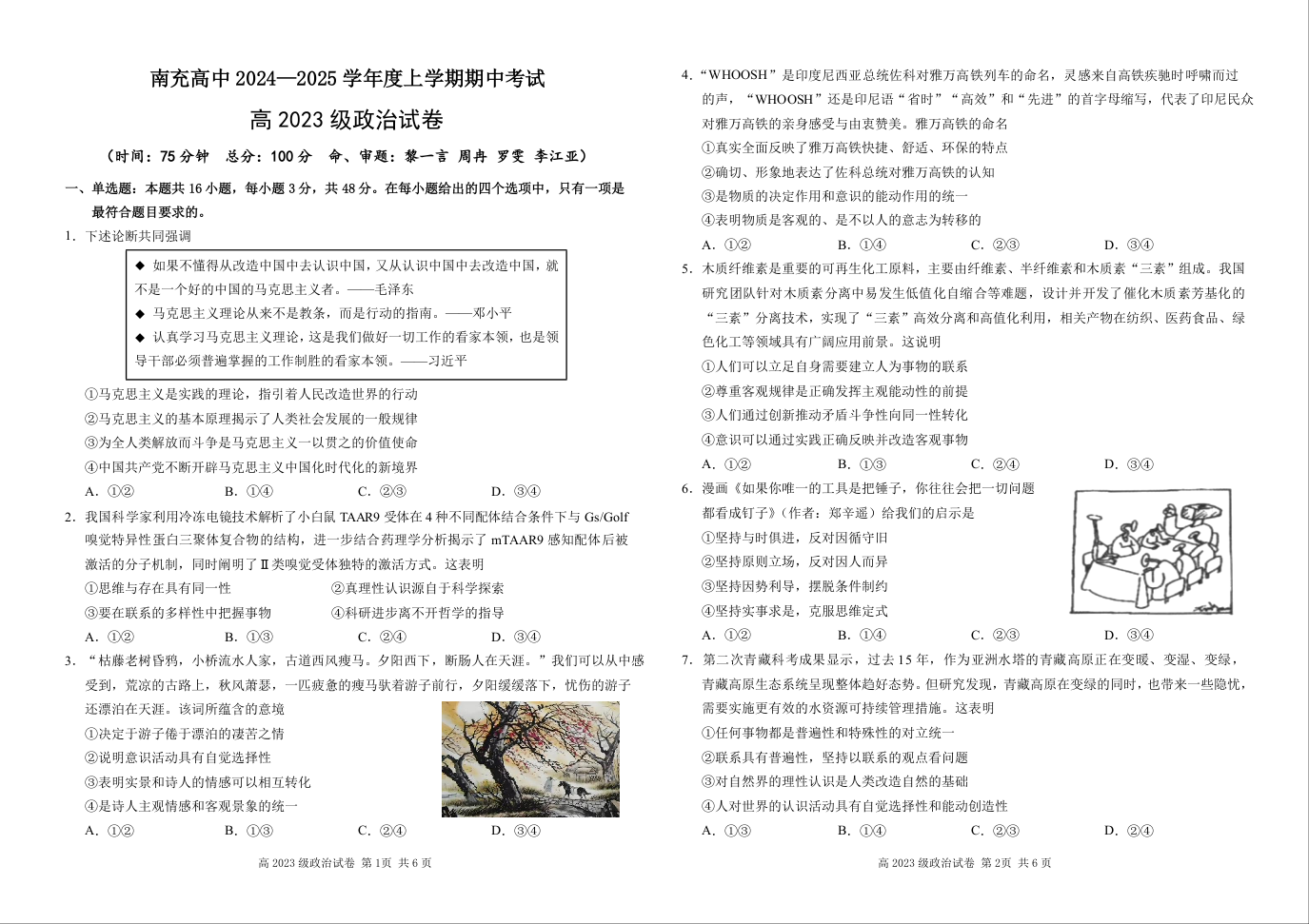 四川省南充高级中学2024-2025学年度上学期期中考试政治