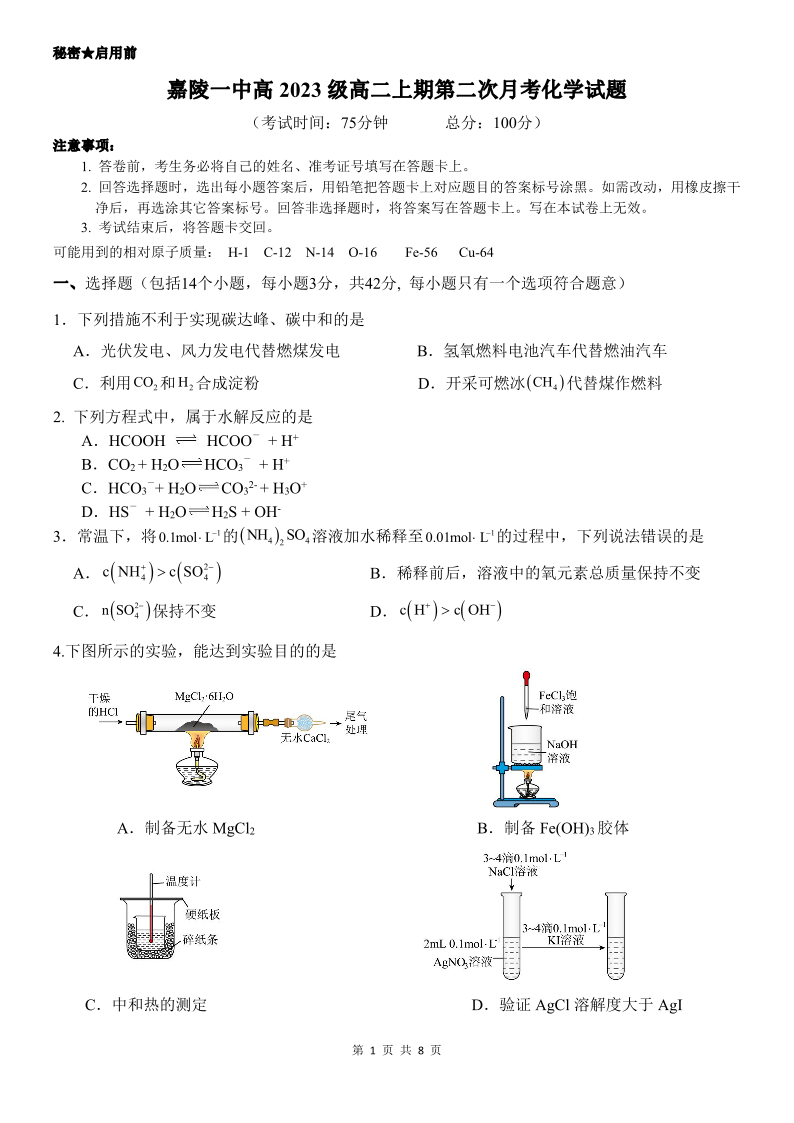 四川省南充市嘉陵一中高2023级高二上期11月考化学