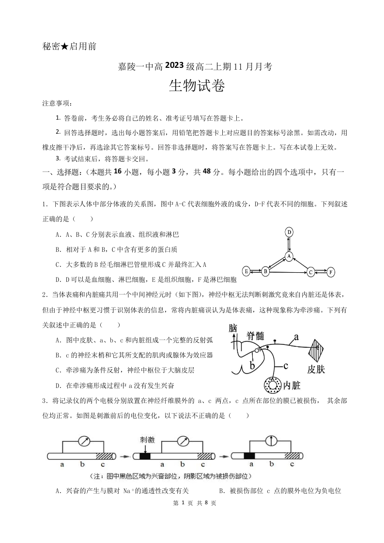 四川省南充市嘉陵一中高2023级高二上期11月考生物