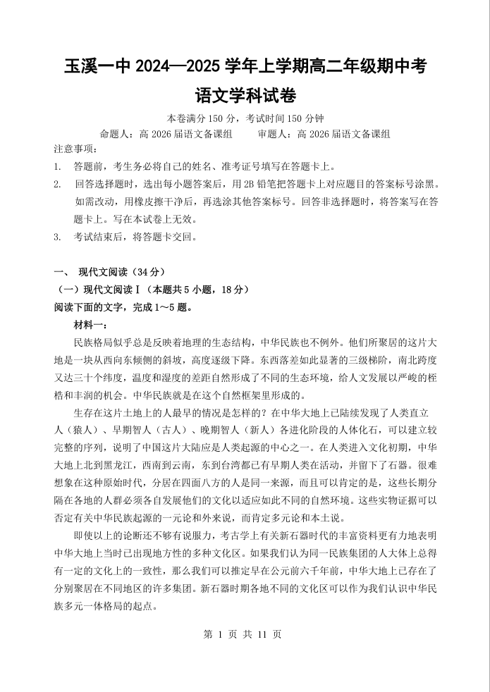 云南省玉溪市一中2024-2025学年高二上学期期中考试语文(原卷版)