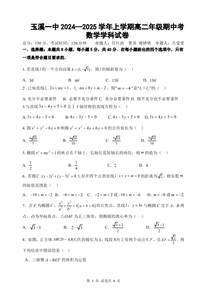 云南省玉溪市一中2024-2025学年高二上学期期中考试数学