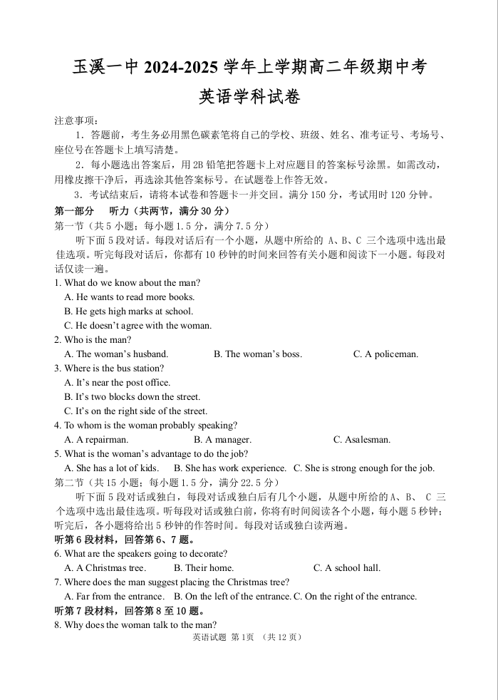 云南省玉溪市一中2024-2025学年高二上学期期中考试英语