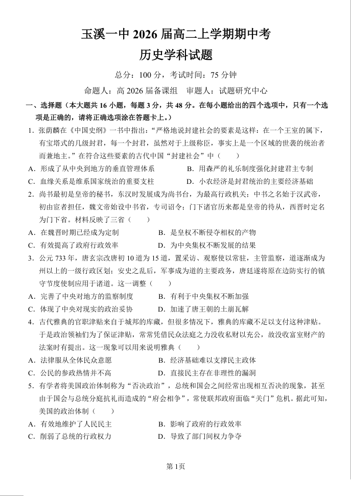 云南省玉溪市一中2024-2025学年高二上学期期中考试历史