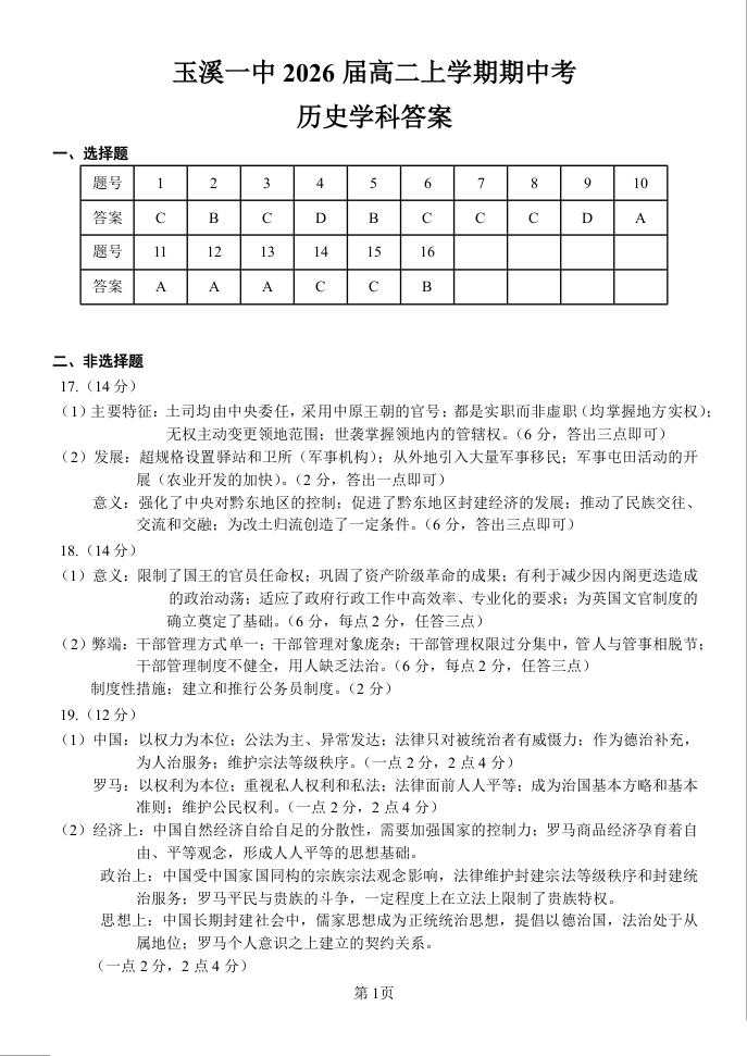云南省玉溪市一中2024-2025学年高二上学期期中考试历史答案