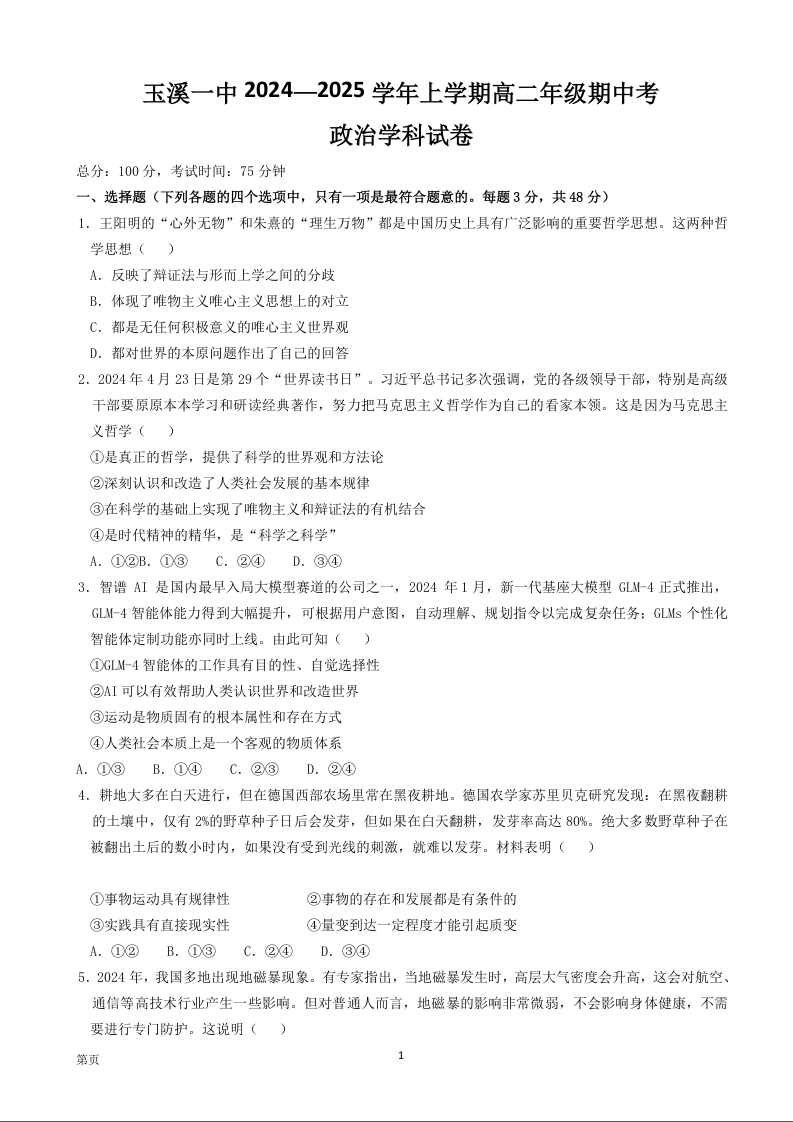 云南省玉溪市一中2024-2025学年高二上学期期中考试政治