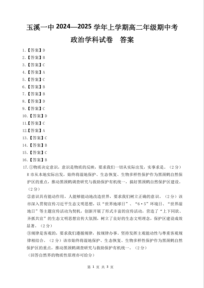 云南省玉溪市一中2024-2025学年高二上学期期中考试政治答案