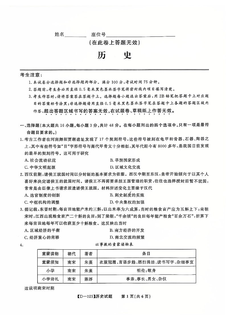 安徽省皖江名校2025届高三上学期12月质量检测历史