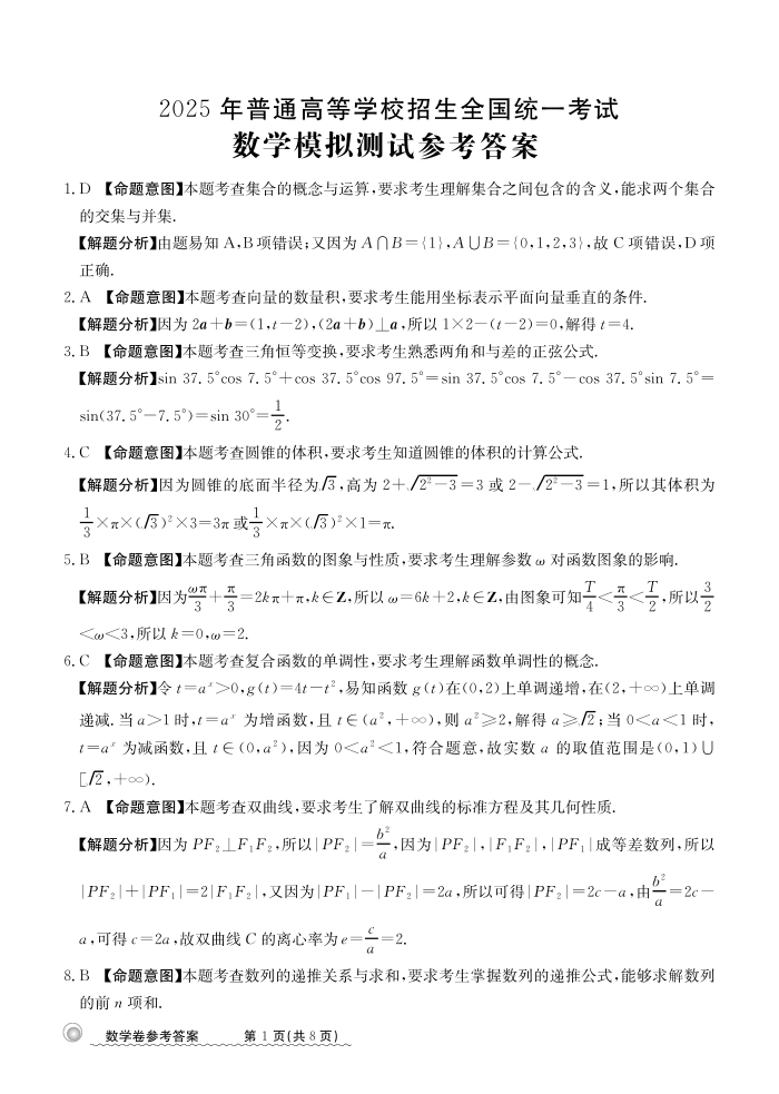 甘肃省部分学校2025届高三12月模拟测试联考数学答案