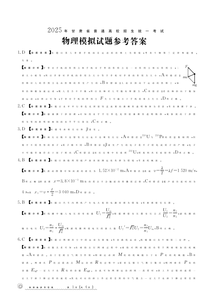 甘肃省部分学校2025届高三12月模拟测试联考物理答案
