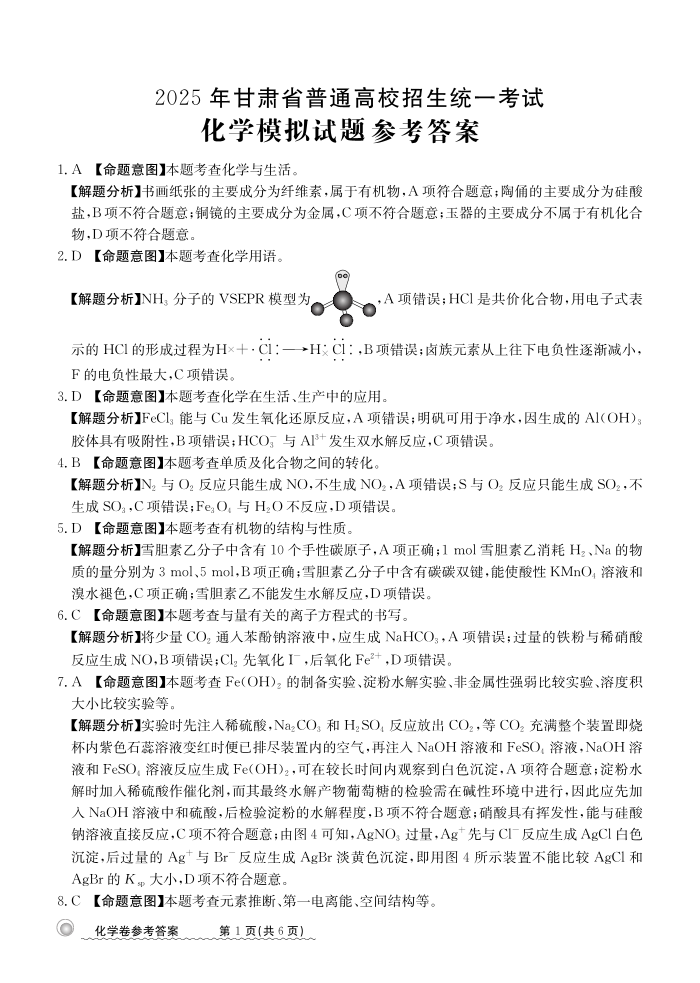 甘肃省部分学校2025届高三12月模拟测试联考化学答案