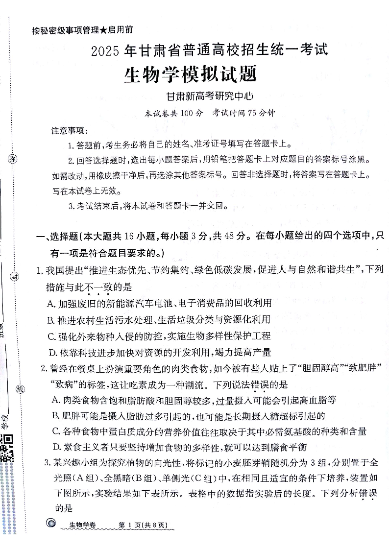 甘肃省部分学校2025届高三12月模拟测试联考生物学