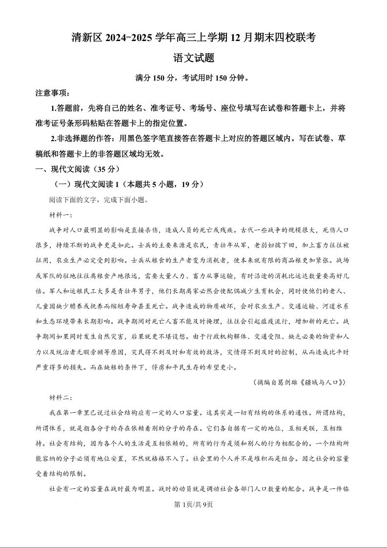 广东省清远市清新区四校2025届高三上学期期末联考语文(原卷版)