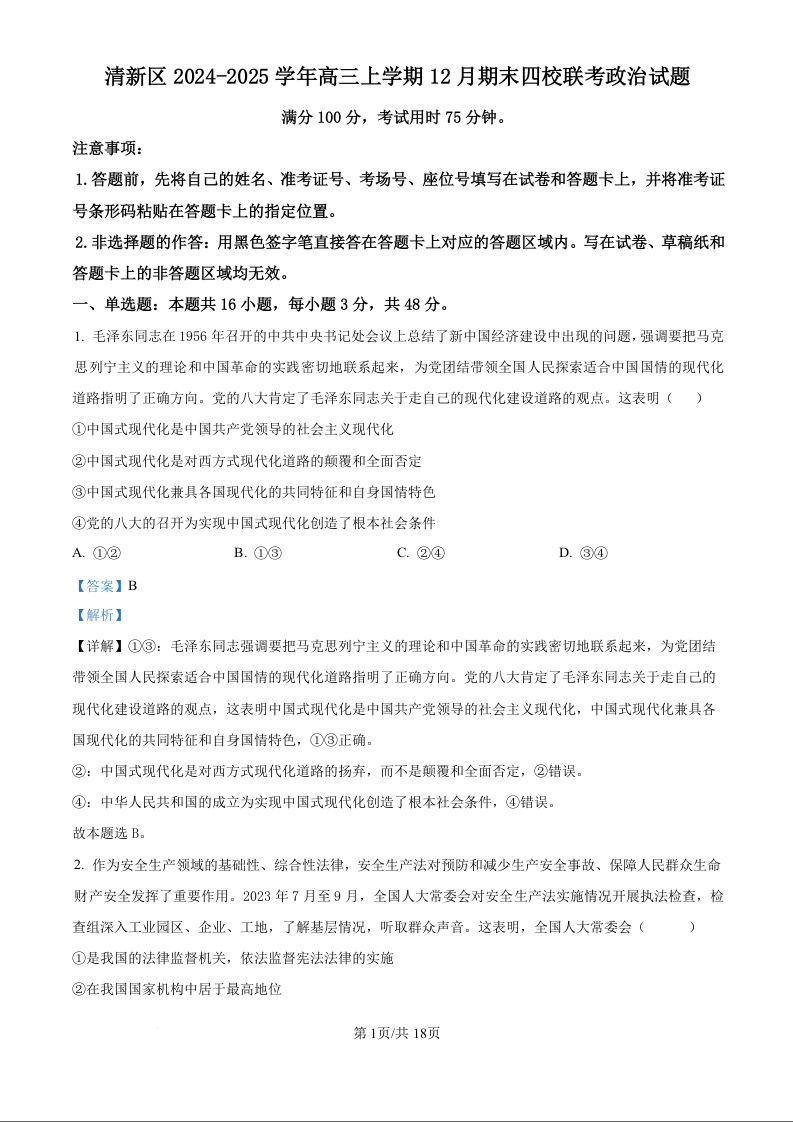 广东省清远市清新区四校2025届高三上学期期末联考政治(精品解析版)