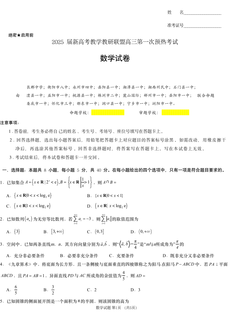 湖南省长郡二十校联盟2025届高三上学期第一次预热演练数学