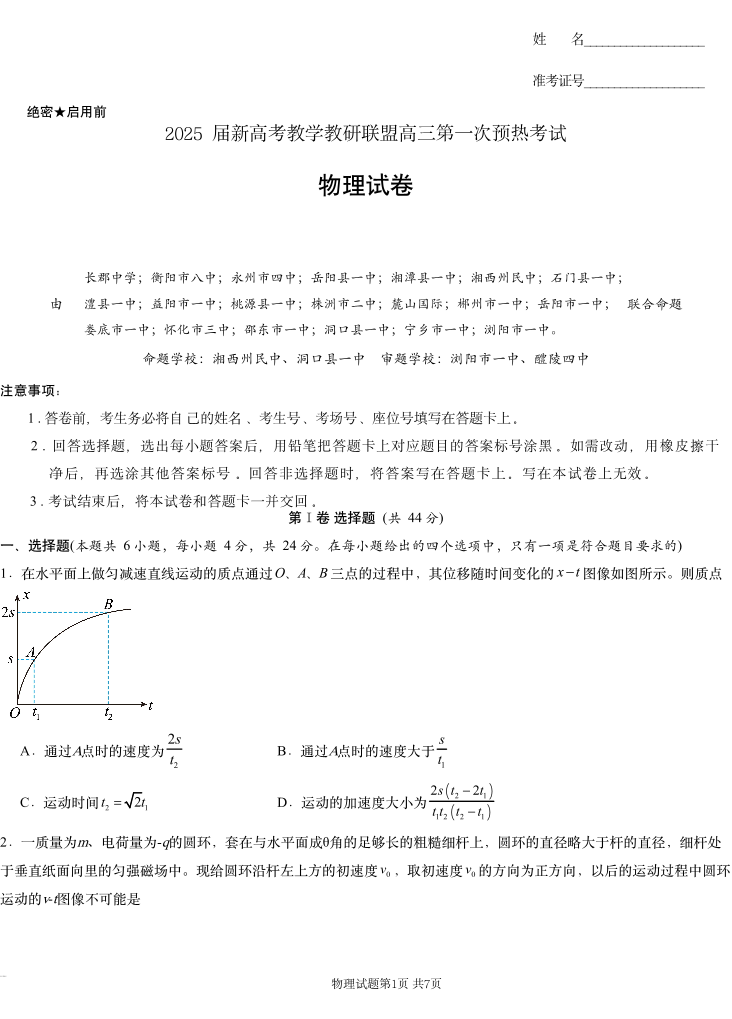 湖南省长郡二十校联盟2025届高三上学期第一次预热演练物理