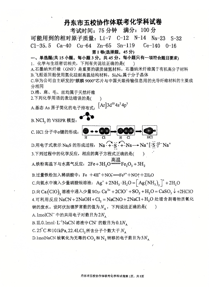 辽宁省丹东市五校协作体2025届高三上学期12月月考化学+答案