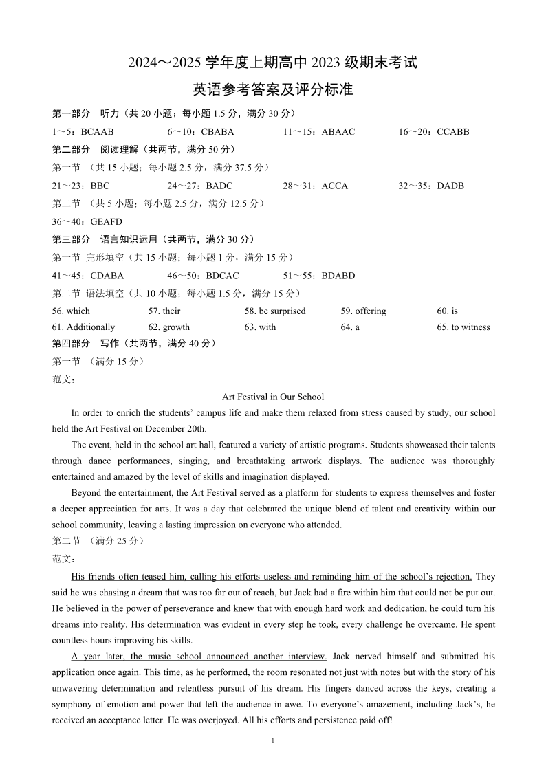 四川省成都市蓉城名校联盟2024-2025学年高二上学期期末考试英语答案