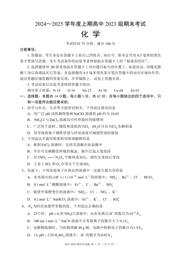 四川省成都市蓉城名校联盟2024-2025学年高二上学期期末考试化学