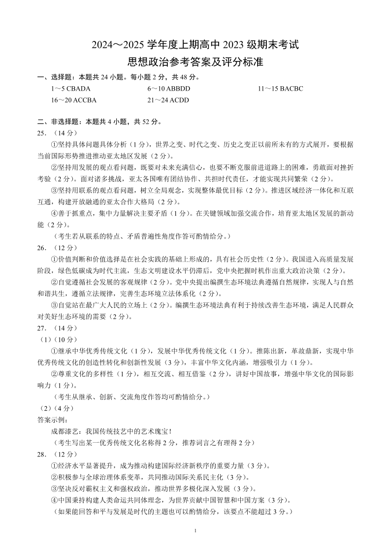 四川省成都市蓉城名校联盟2024-2025学年高二上学期期末考试政治答案