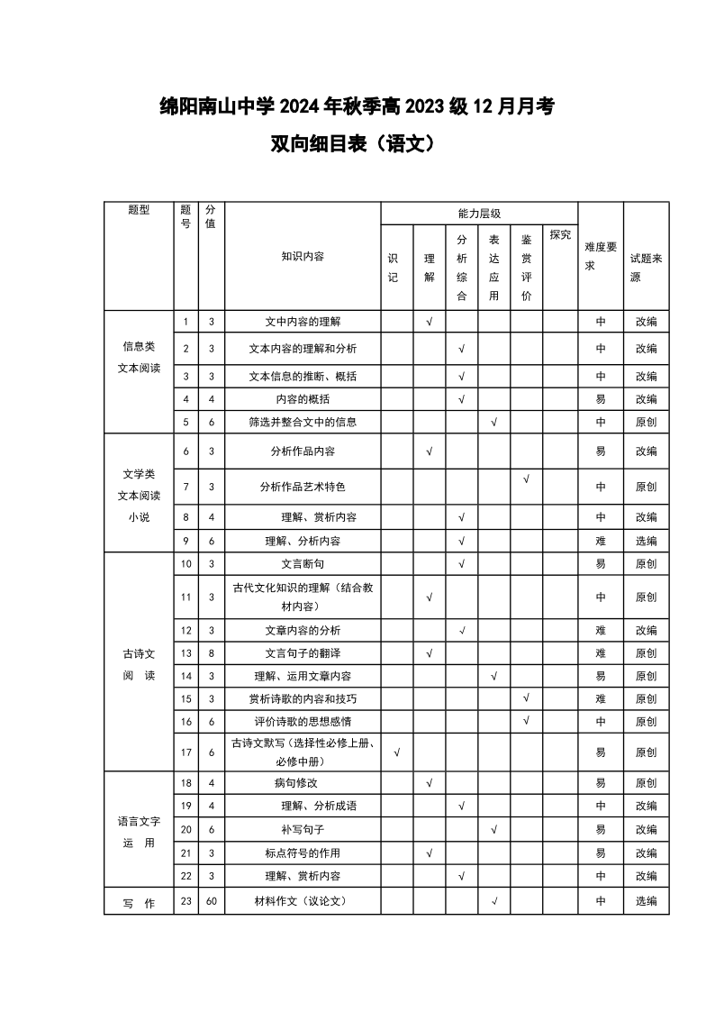 四川省绵阳市南山中学2024-2025学年高二上学期12月月考语文双向细目表