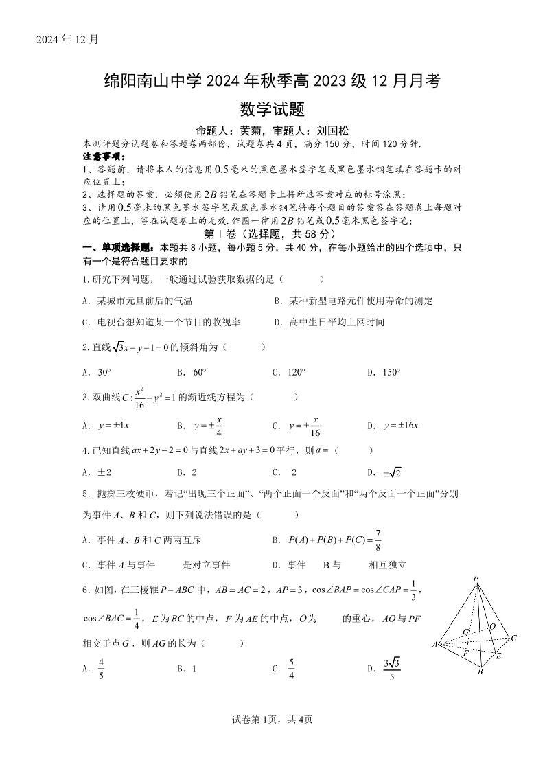 四川省绵阳市南山中学2024-2025学年高二上学期12月月考数学