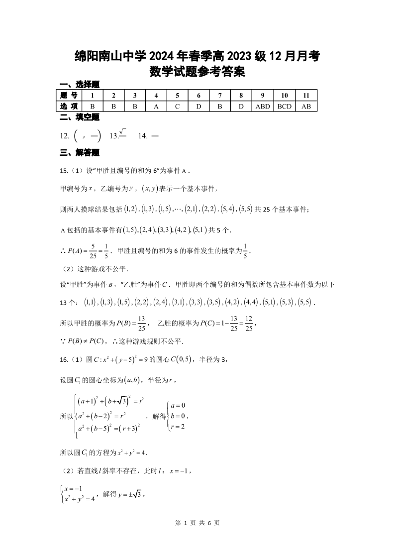 四川省绵阳市南山中学2024-2025学年高二上学期12月月考数学答案