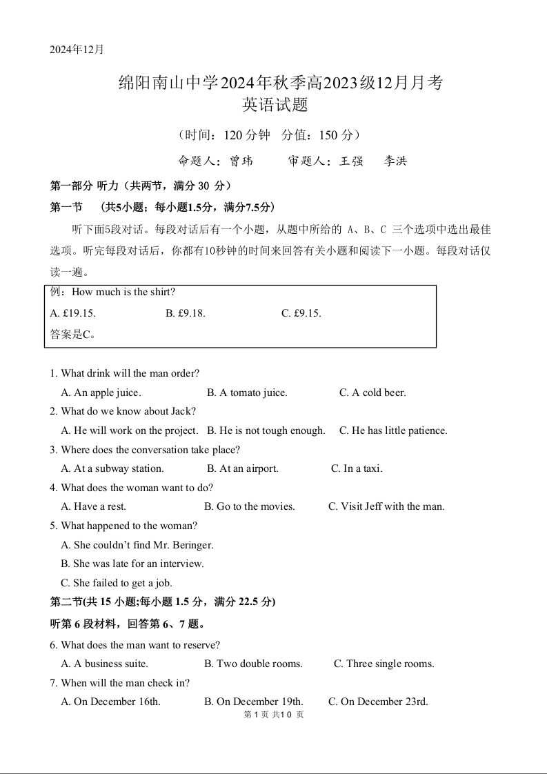 四川省绵阳市南山中学2024-2025学年高二上学期12月月考英语