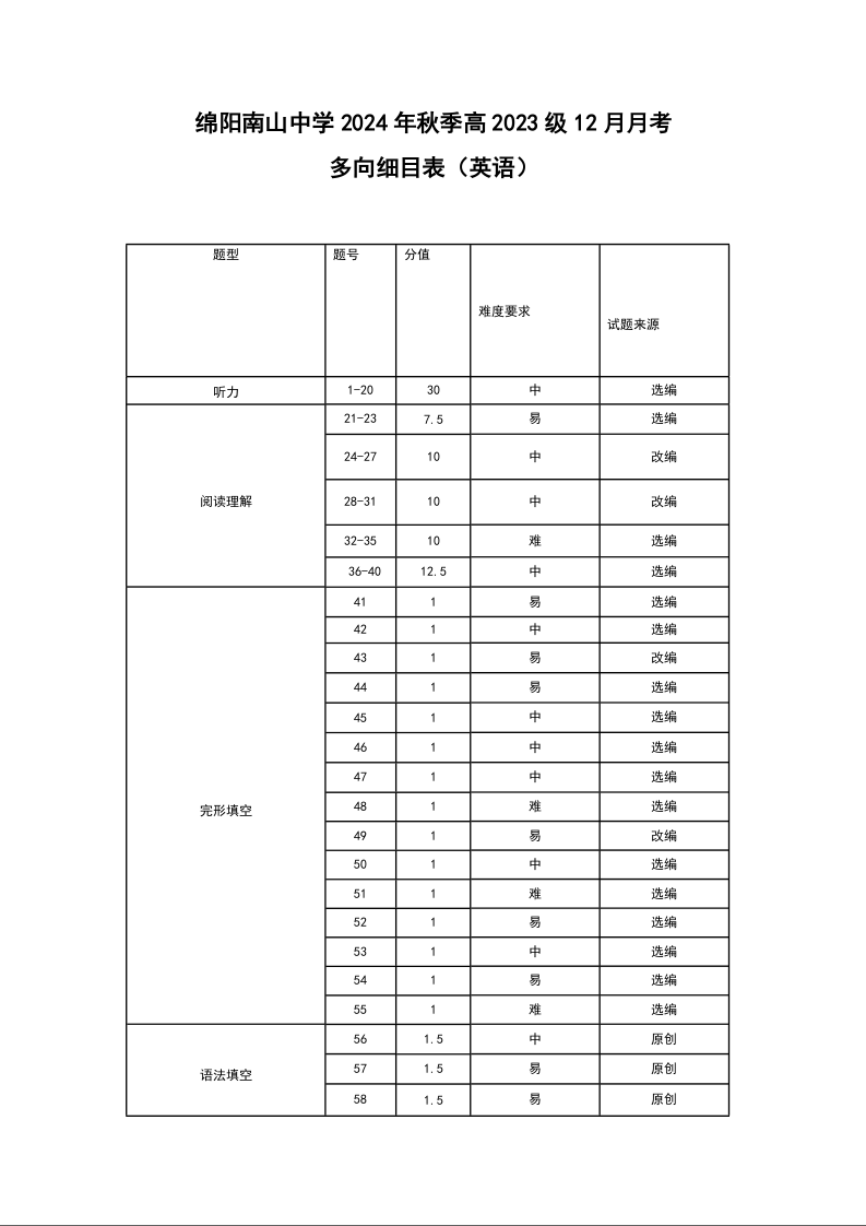 四川省绵阳市南山中学2024-2025学年高二上学期12月月考英语细目表
