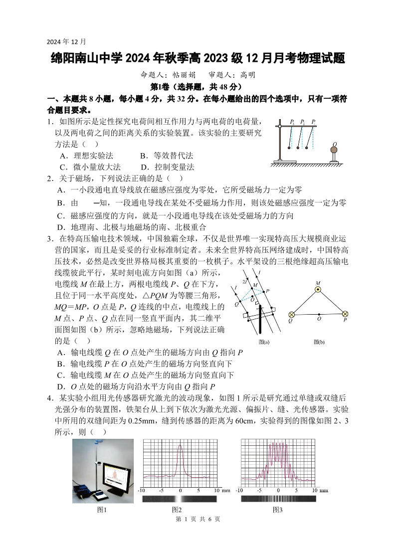 四川省绵阳市南山中学2024-2025学年高二上学期12月月考物理