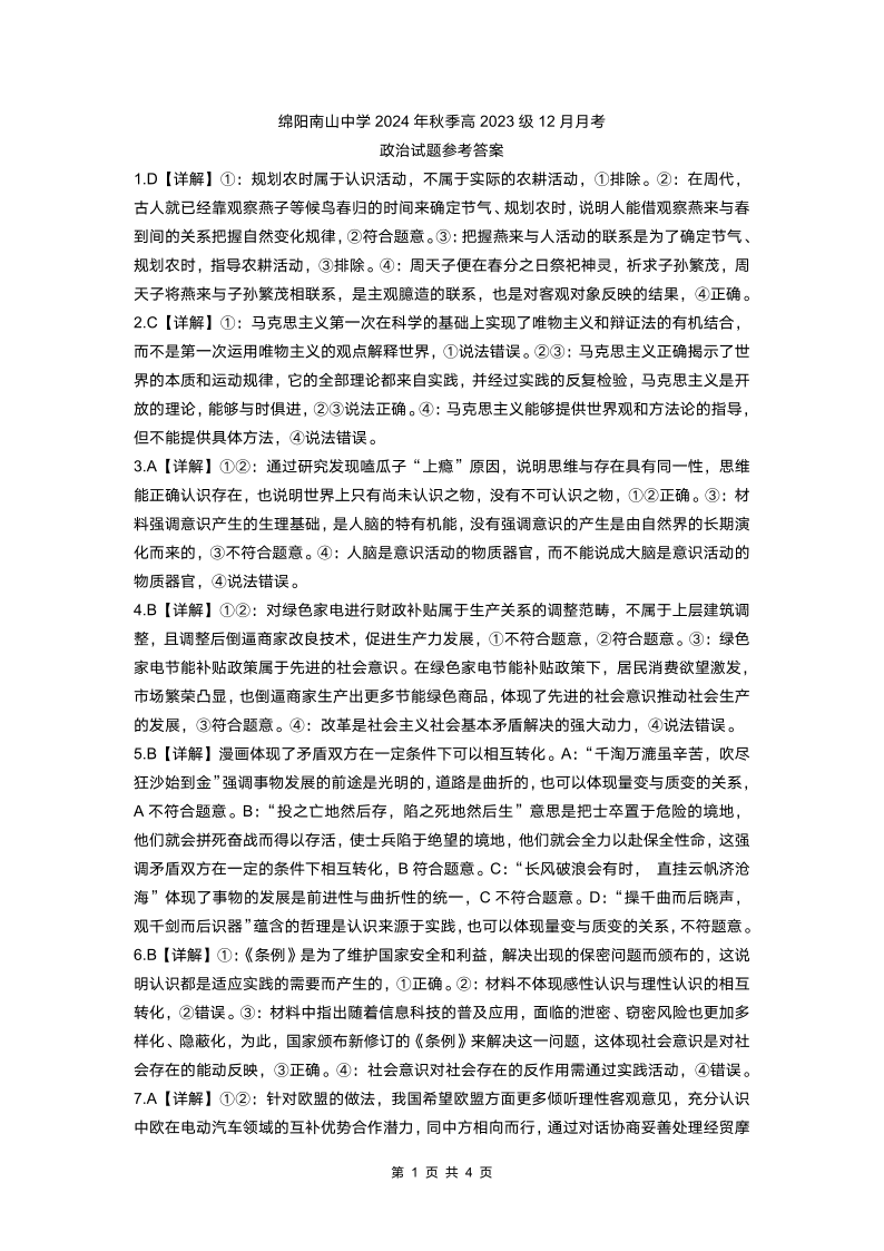 四川省绵阳市南山中学2024-2025学年高二上学期12月月考政治答案