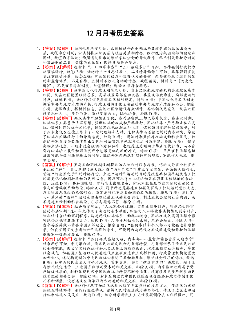 四川省绵阳市南山中学2024-2025学年高二上学期12月月考历史答案解析