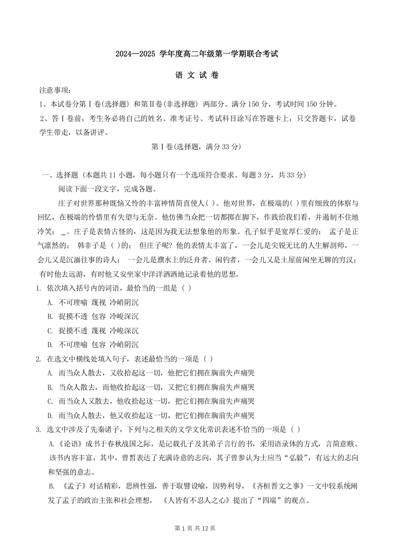 天津市三校2024-2025学年高二上学期12月联考试题语文(原卷版)