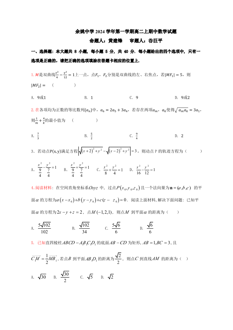 浙江省宁波市余姚中学2024学年第一学期期中考试数学
