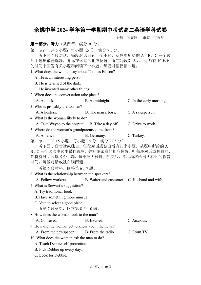 浙江省宁波市余姚中学2024学年第一学期期中考试英语