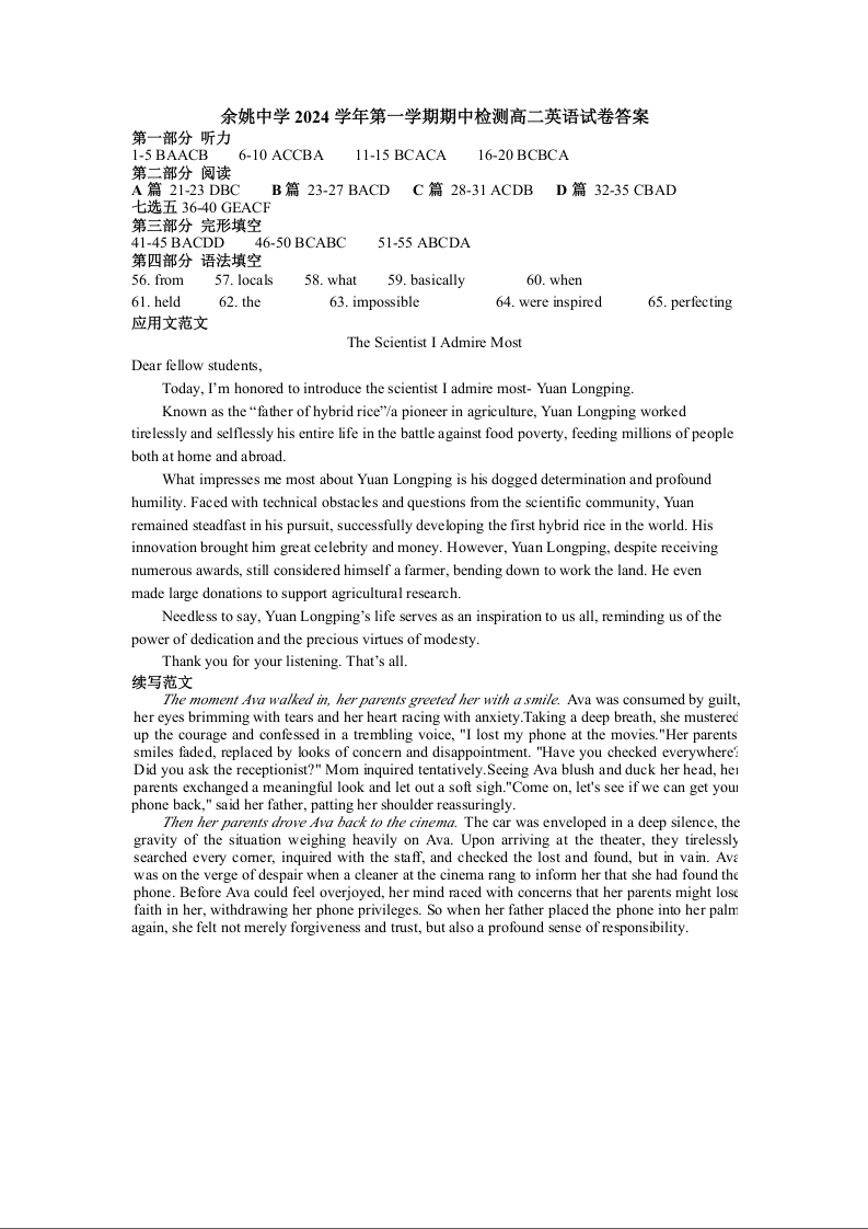 浙江省宁波市余姚中学2024学年第一学期期中考试英语答案