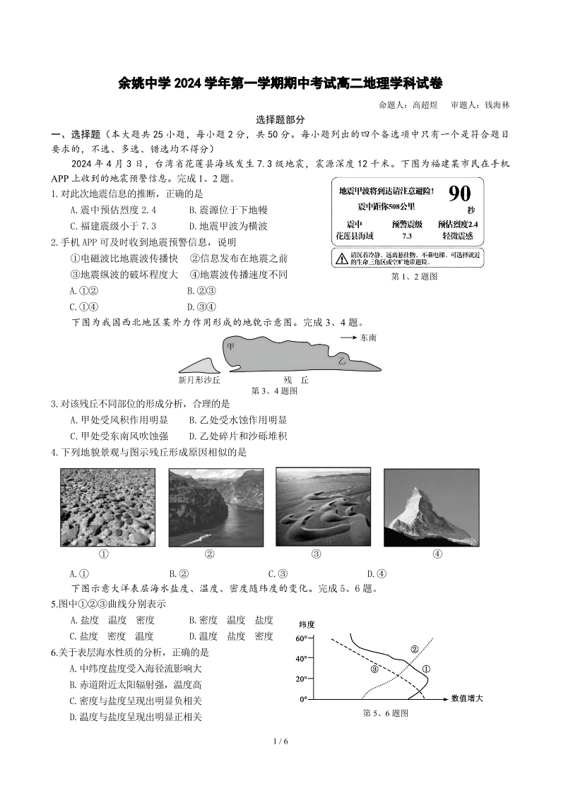 浙江省宁波市余姚中学2024学年第一学期期中考试地理