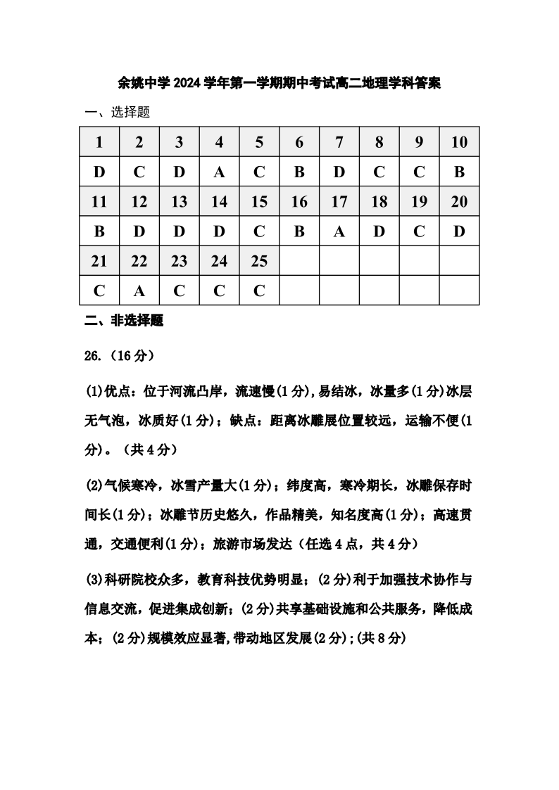 浙江省宁波市余姚中学2024学年第一学期期中考试地理答案