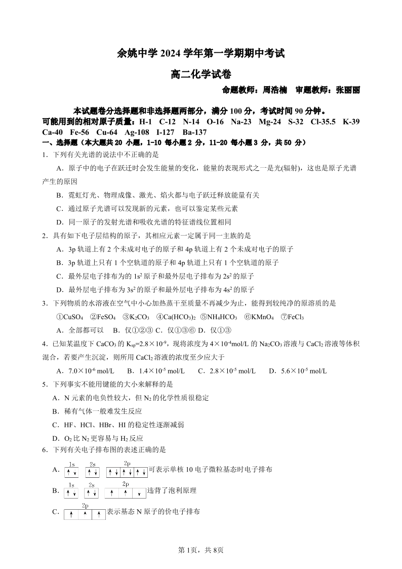 浙江省宁波市余姚中学2024学年第一学期期中考试化学