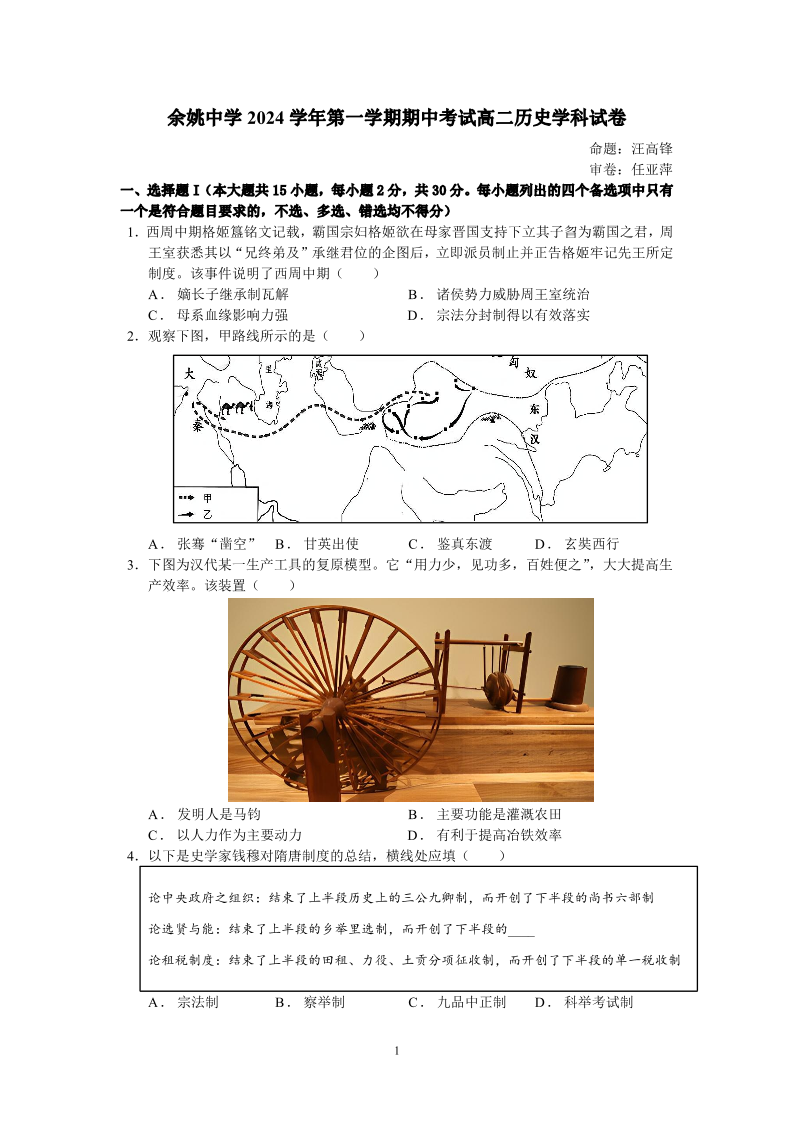 浙江省宁波市余姚中学2024学年第一学期期中考试历史