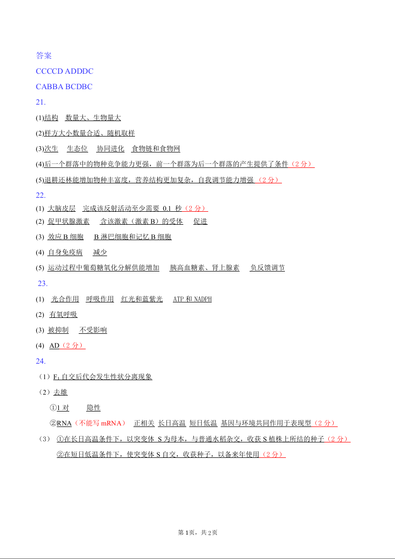 浙江省宁波市余姚中学2024学年第一学期期中考试生物答案