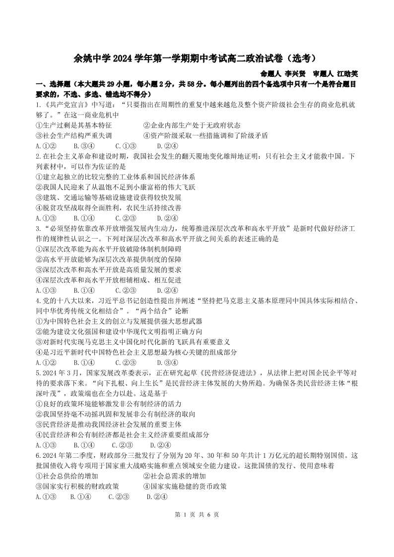 浙江省宁波市余姚中学2024学年第一学期期中考试政治