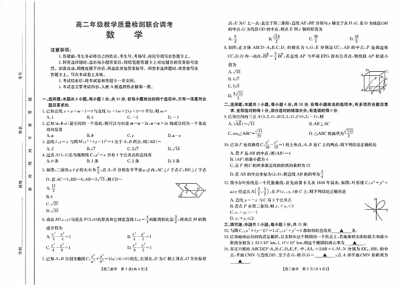 山东省部分高中2024-2025学年高二上学期12月联考数学+答案解析
